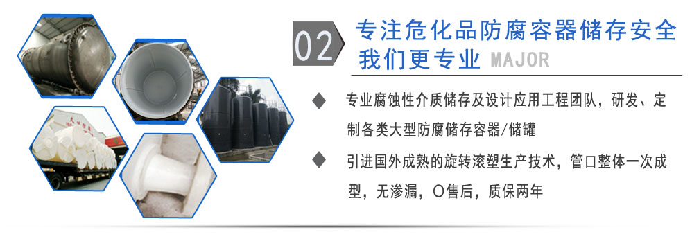 公司有鋼襯塑PE/PO、PE全塑、碳鋼、不銹鋼四大系列100多個品種,專注于常壓儲存容器生產,其產品包括鋼襯塑儲罐、管口一體成型PE儲罐、碳鋼儲罐不銹鋼儲罐、反應釜、攪拌罐、離子交換柱、鋼襯PE/PO儲罐塑料儲罐、鹽酸儲罐硫酸儲罐等等。更大限度滿足廣大客戶的各種需求,同時可以根據客戶的需要加工定制各種防腐設備。